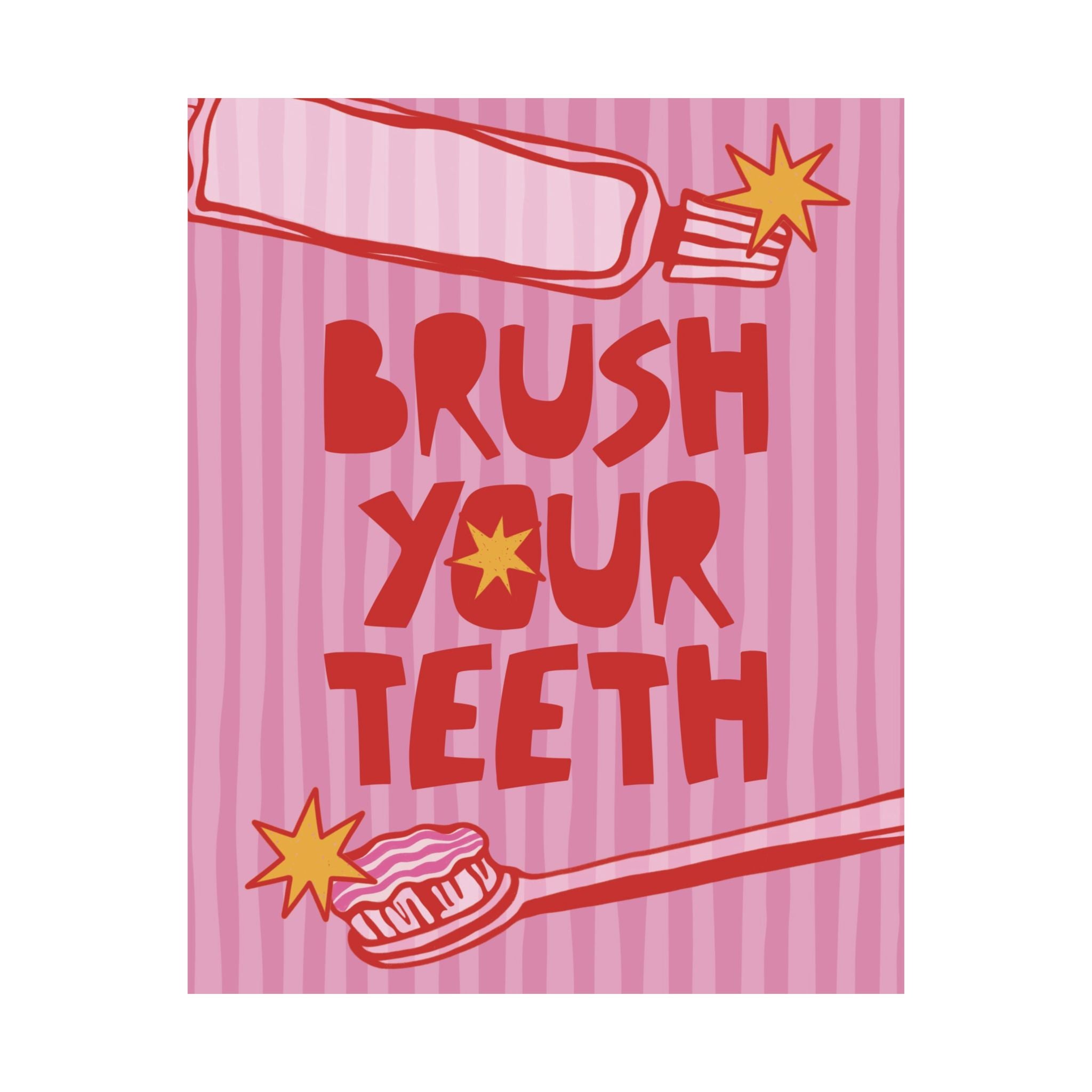 Bring a burst of color and personality to your bathroom with this eclectic "Brush your teeth" poster. Featuring bold red and pink tones alongside a playful hand-drawn toothpaste and toothbrush, it sure will never make you miss brushing your teeth! It's a fun way to remind you to keep your smile fresh every day.