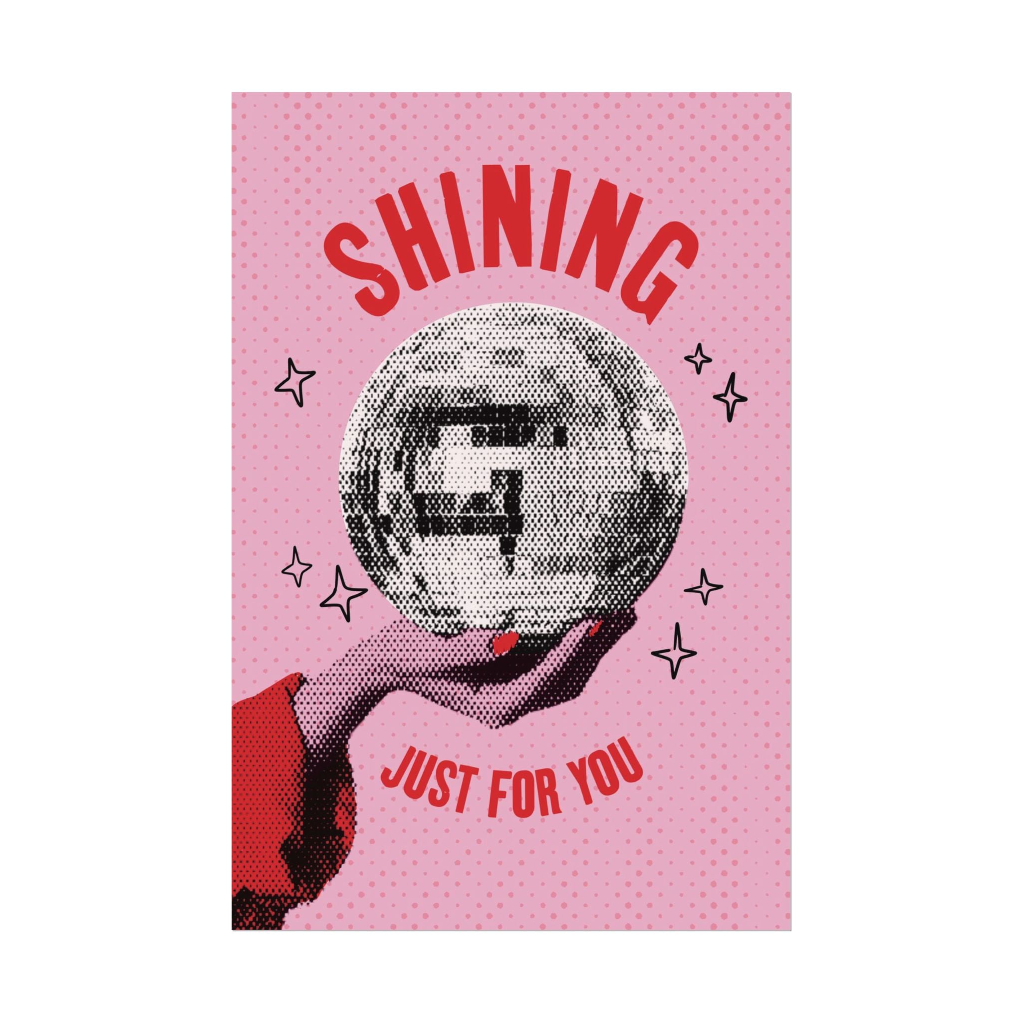 Get ready to add some serious color and fun to your walls with our halftone disco ball poster. This cute and retro print features a hand, with bright red nail polish, holding a discoball, with the lyrics "Shining just for you". It's the perfect addition to all the mirrorball girlies out there!