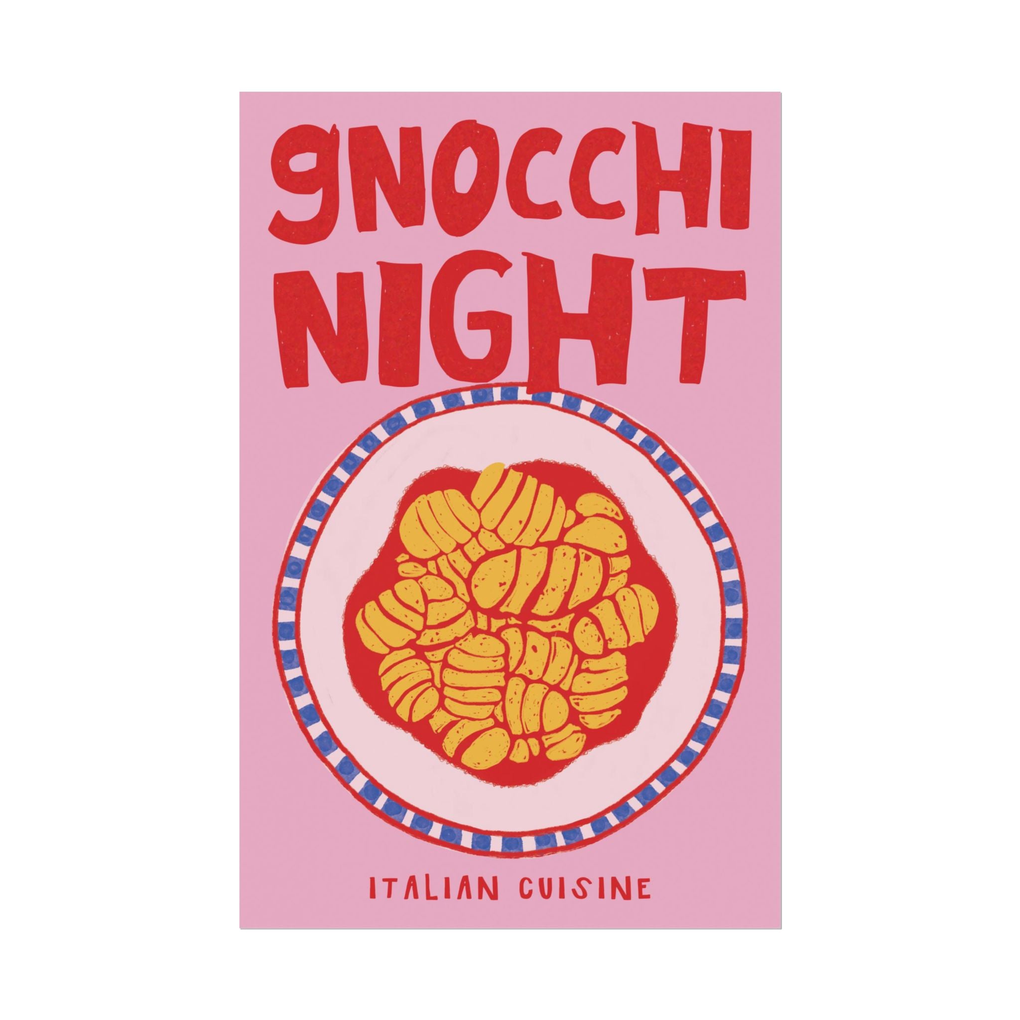 Celebrate good eats with this quirky retro gnocchi night poster! Featuring a funky hand-drawn illustration of a gnocchi plate, it's the perfect addition to your space for a touch of personality and pops of color. Buon appetito!