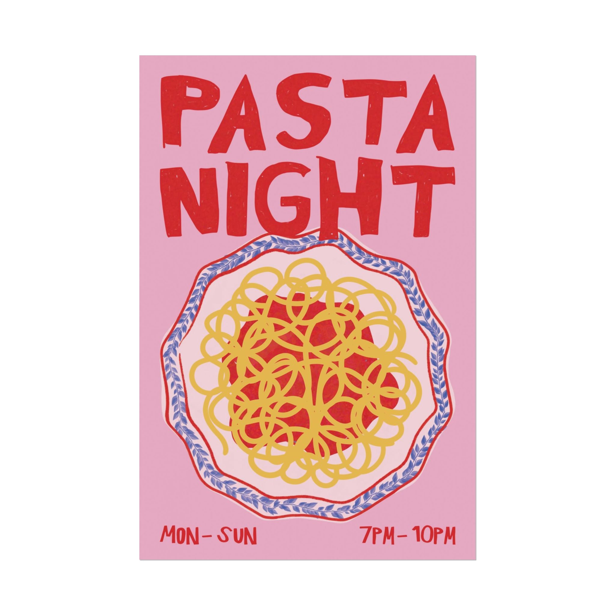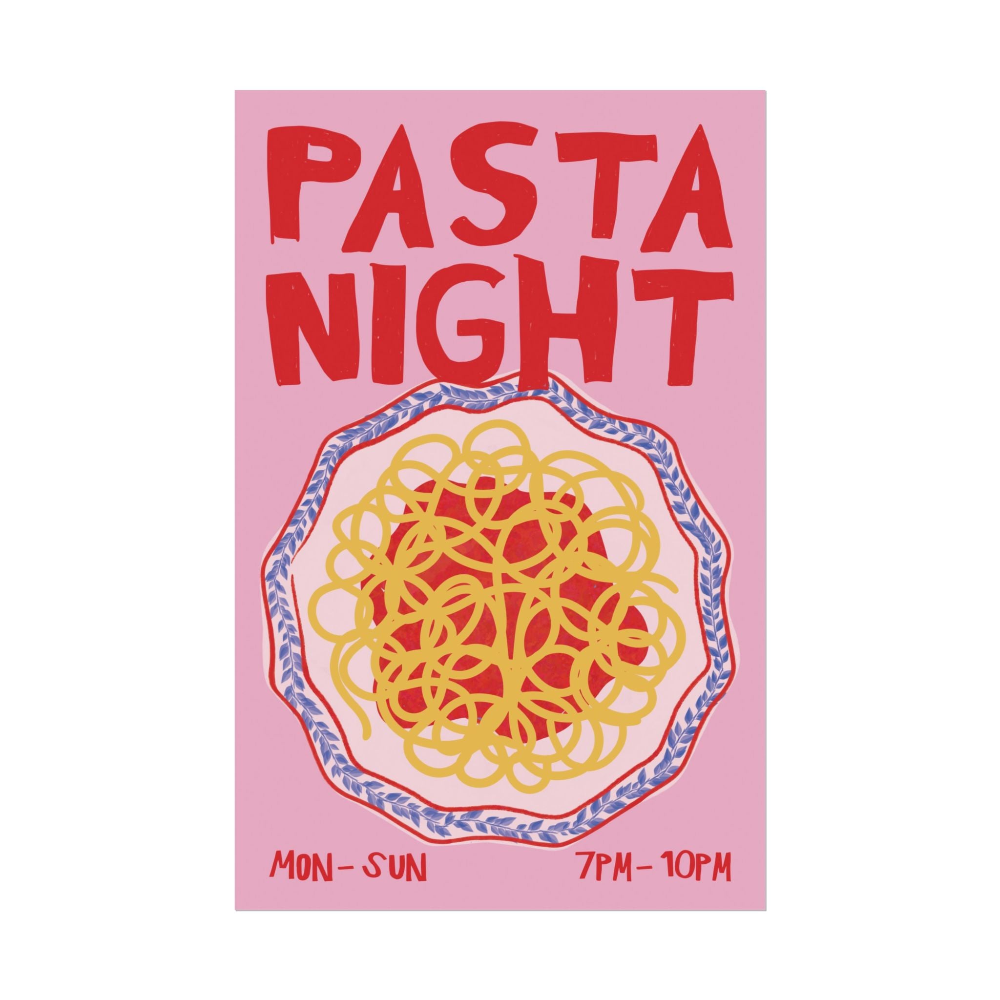 Add some "spaghetti-ness" to your home with this funky retro pasta night poster, because every night is pasta night! Featuring a fun and retro design, this print is perfect for creating a pop of color and personality in your kitchen, dining area, or any space you choose. Cook up some fun with this unique wall print!