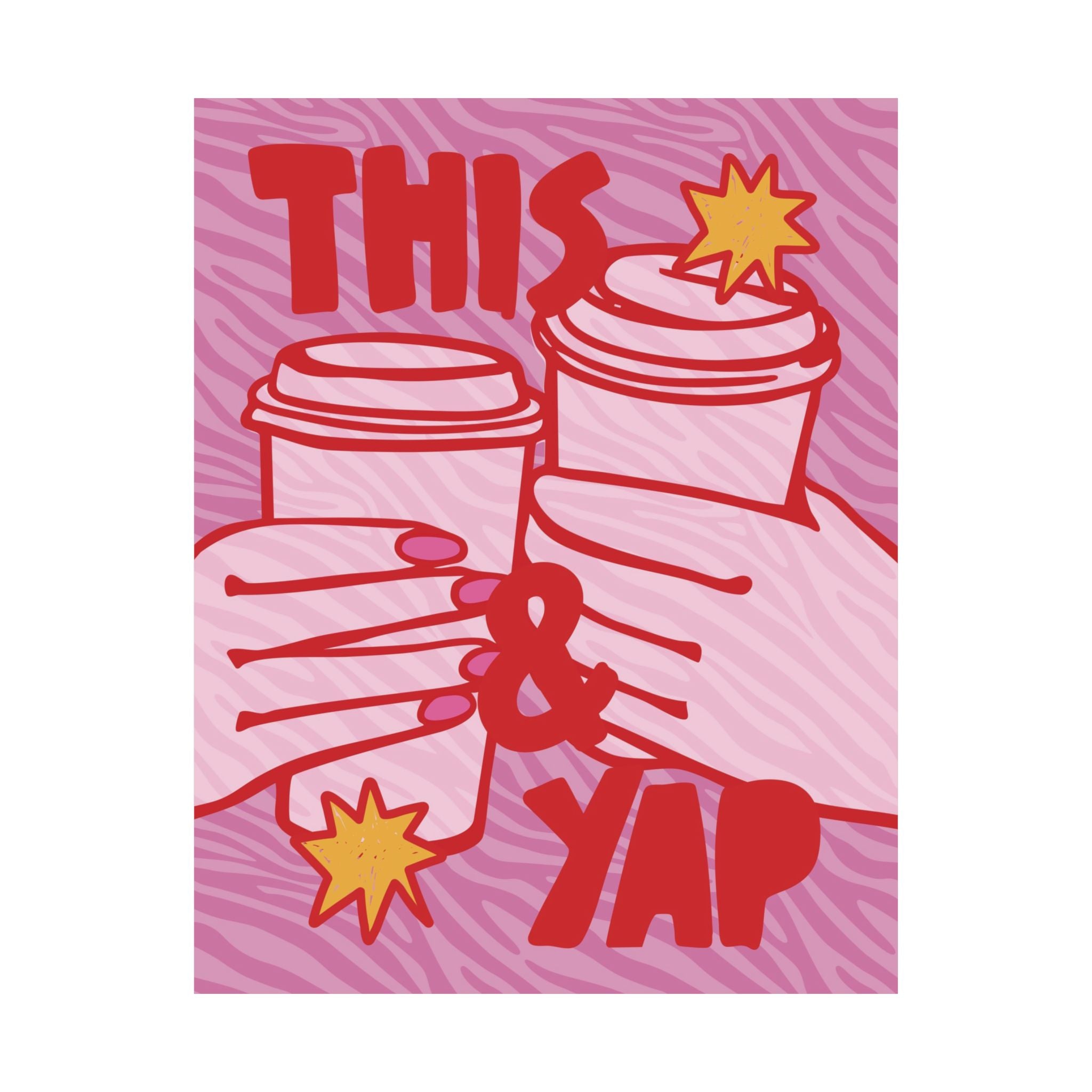 Capture the joy of coffee dates and endless yapping sessions with this fun and vibrant poster. Featuring bold font, charming hand-drawn details, and a lively red and pink color palette, it adds a splash of color and personality to any room. Perfect for celebrating your love of caffeine and good company.